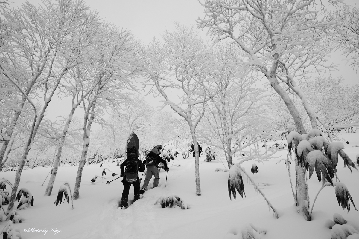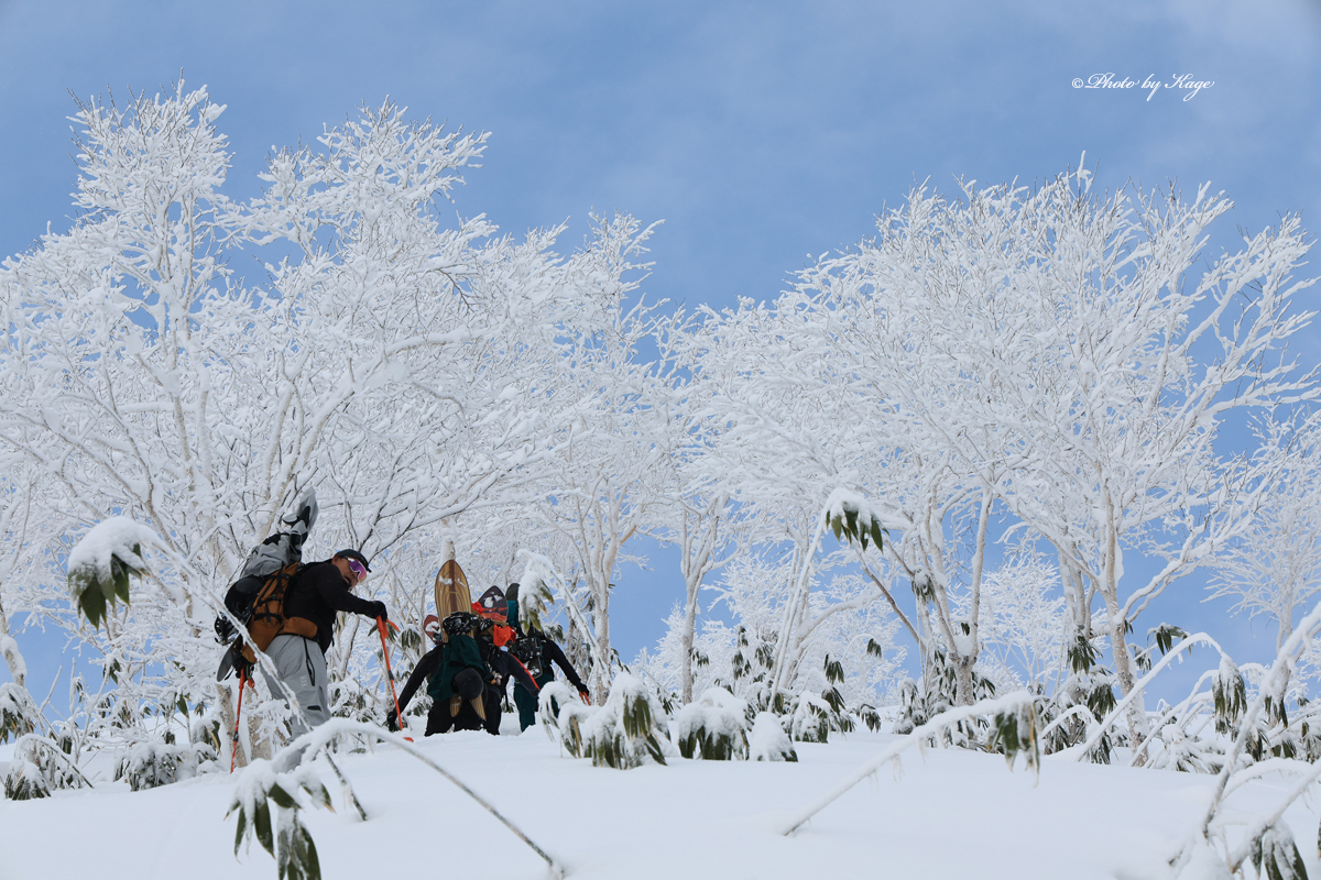 僕はフォトグラファーという立場だが、もし自分がガイドなら今日は何処に行こうかな?と毎日のように考える。気圧配置図や複数の天気予報サイトをチェックして天気を予想し、山や町の風向風速、気温の変化を一日に何回もチェックし、前日自分で見た山の状況、仲間の滑って来たポイントの情報等から、今日何処に行くべきかを考えている。今日もプラス気温となり、昨夜からの暖気や雨の影響でガスが発生する可能性が考えられたし、また前日人が入っているとトラックが固まっている可能性があるのでノートラックを狙いたかった。なので、ガスが無く視界に問題無ければあそこを狙い、ガスがあるならあっちだなと考えていたのだが、本日のリーダーガイドマコちゃん(山田誠)が選択した行先とピタリと一致していた。心配していたガスは何とか問題なさそうなので、行先はあそこに決まった。