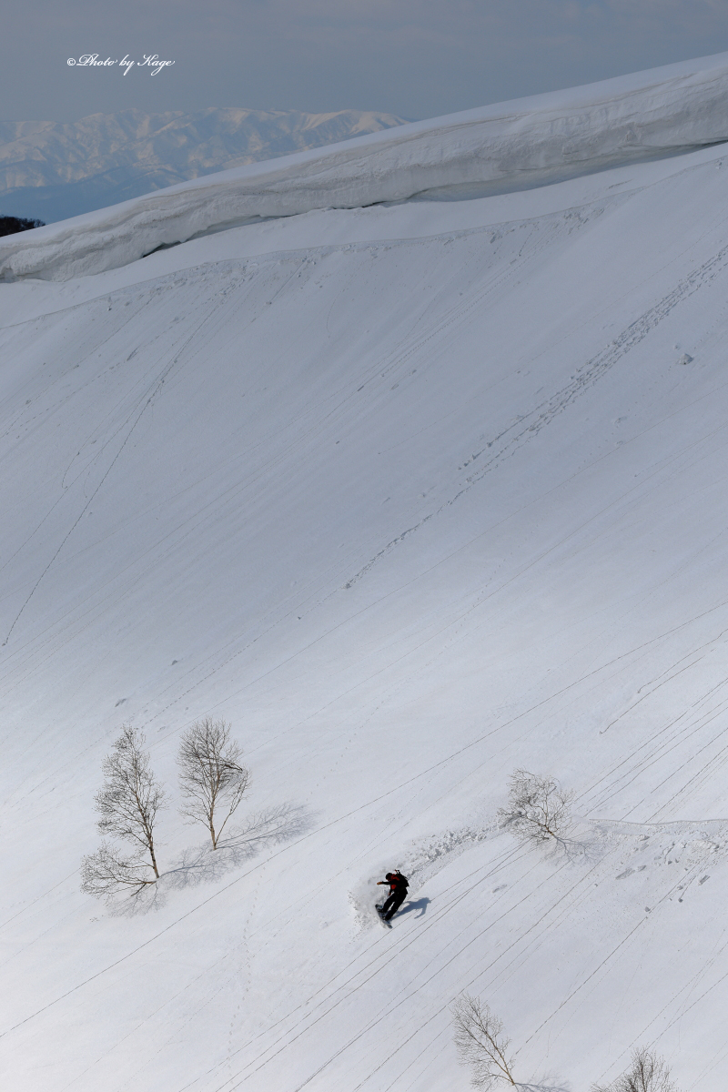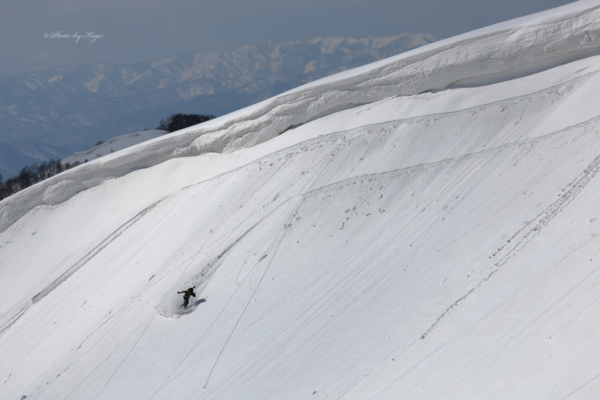 朝ツアーが始まる前に3人の内の1人が、「俺はハイクが苦手だから、一本だけ滑って帰りたい」と言い出し、プライベートプランなので絶対に不可能ではないのだが、車で待っていて貰うとか、誰かに迎えに来て貰うとか何かと大変なので、出来れば最後まで一緒に行動して貰いたい。何とか騙し騙し行動を共に出来るような方法を考えた。まぁ結果は登り返して2本滑ってくれて、皆で楽しく最後まで行動を共に出来た。コンディションは降雪が無いので昨日同様にハードパックバーンの上に薄っすらと載ったパウダーがある感じだったし、晴れの天気予報ながら雲が多く、光のタイミングを合わせるのが物凄く難しかったけど、ハイクシーンなど良い写真が撮れたし、何より仲良し3人組と僕らも楽しくツアーが出来たので良かった。
