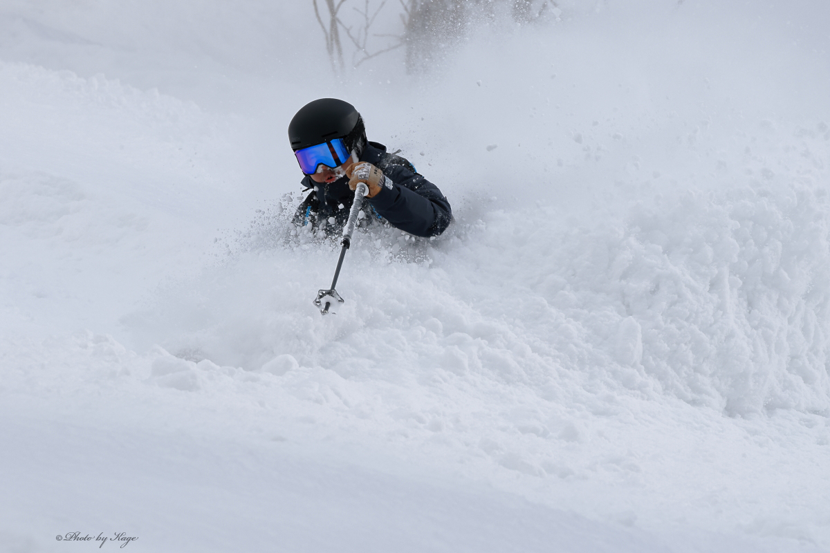 腰から胸のディープパウダーを滑るJさんをアップで撮ってみました。