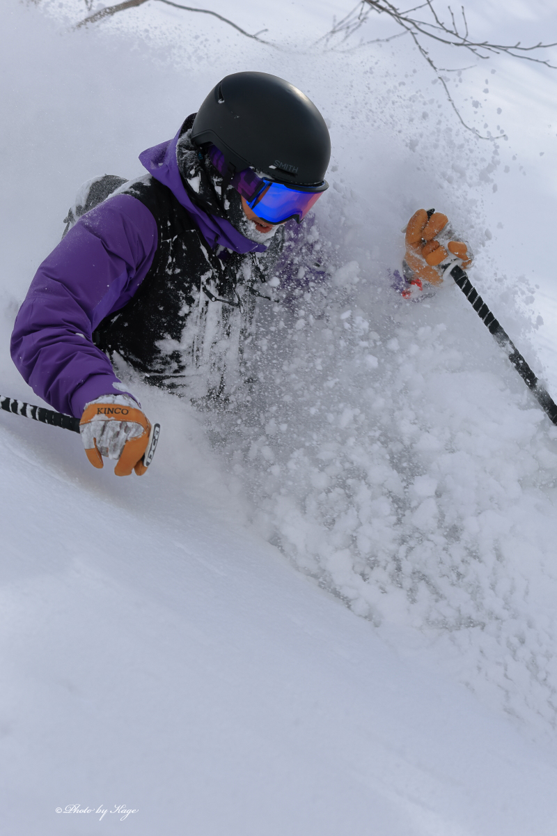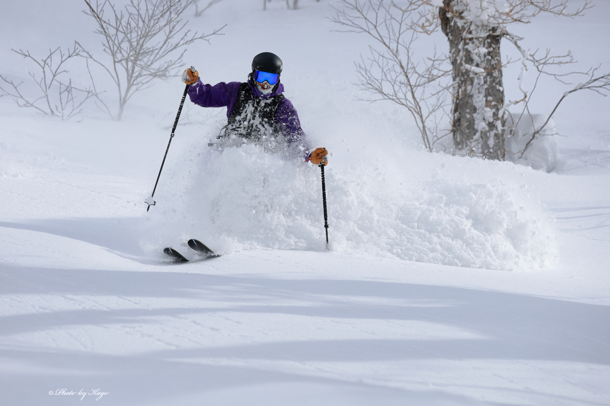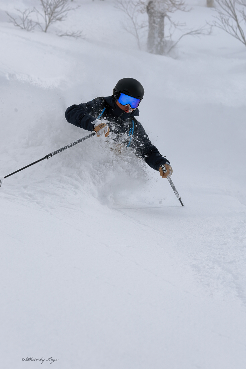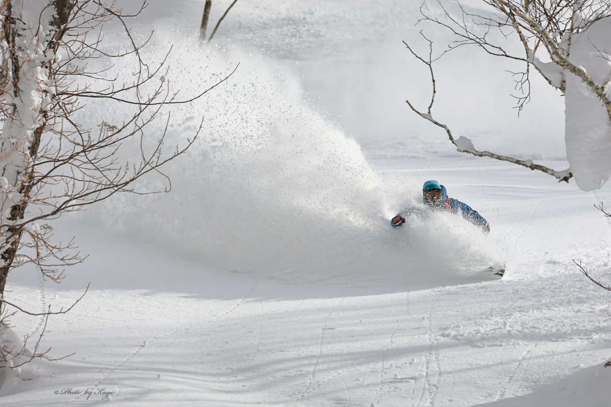 歩き始めて暫くすると、スキーインストラクターのCさんがシールでの登りに苦戦を強いられ、おまけに以前痛めていたと言う膝が痛くなってしまった。本来今日予定していたのはもっと奥の急斜面だったのだが、予定を変更して近場のポイントに行く事にした。それが逆に功を奏し、今日滑った沢、小沢、オープン、ツリーラン4本のライディング全てで丁度滑る時だけ晴れ間に当たり、おまけに普段ならジグ切られていたり、トラックが入っていたりの場所も完全面ツルのノートラック。斜面も極上、雪も極上ディープコンディションと来たモンだから堪らない。残念ながら膝を痛めたCさんは一本の登りで2本滑った後リタイヤし、迎えの車に乗って先に帰ってしまったが、とにかく堪らないスーパーグッドコンディションだった。登っている時には沢山の外国人に会ったが(日本人は0)、僕らが滑ったこの山の王道とも言うべきクラシカルなラインを完全貸切の超極上コンディションで滑れたのは本当に最高だった。しかも、全部晴れ。久しぶり(?)に滑走斜面に変に入ったハイクラインやジグやトラックなどに邪魔されず、気持ち良く一日滑り終えれた気がする。本日のテールガイドの高久智基君の言葉を借りれば、「まるでコロナの時や昔に戻ったかのような奇跡」だった。最高です。そんなワケで今日は1人2枚ずつ写真をアップしちゃいます。