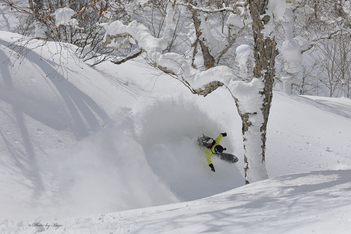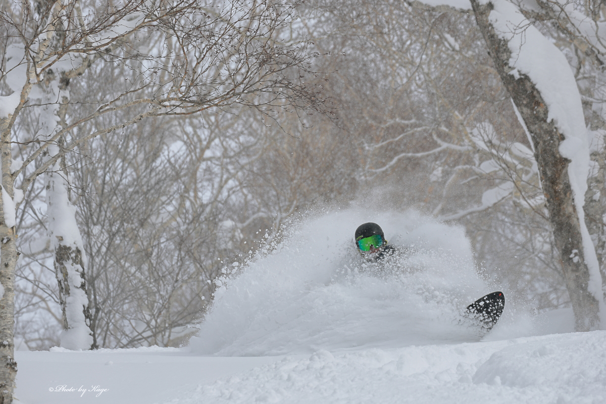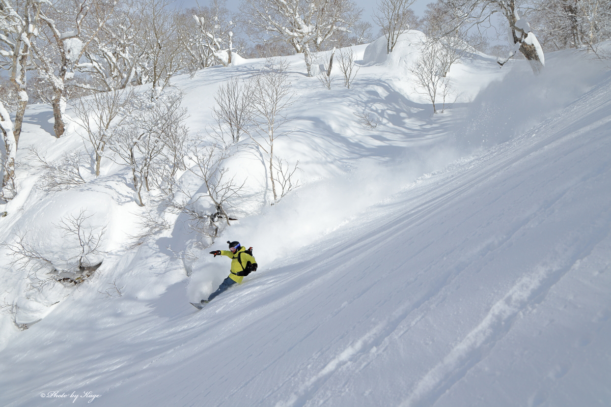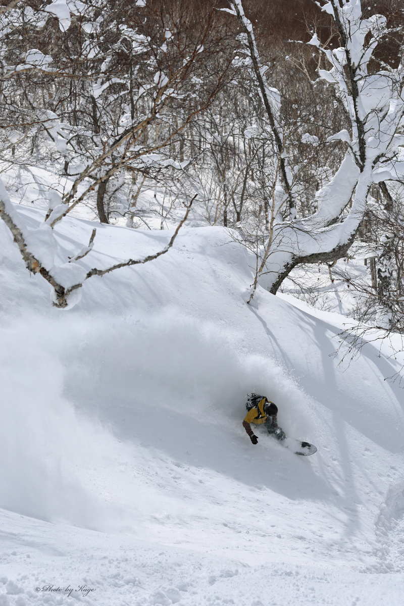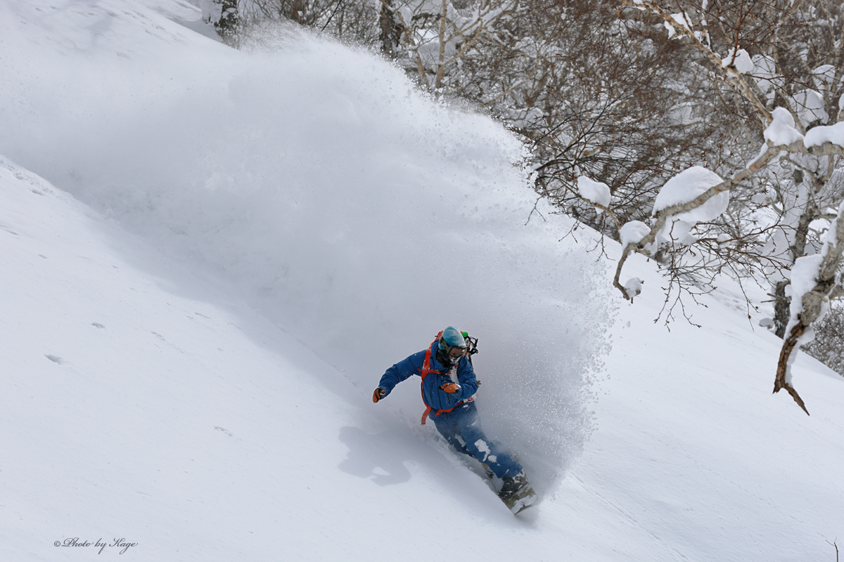 歩き始めて暫くすると、スキーインストラクターのCさんがシールでの登りに苦戦を強いられ、おまけに以前痛めていたと言う膝が痛くなってしまった。本来今日予定していたのはもっと奥の急斜面だったのだが、予定を変更して近場のポイントに行く事にした。それが逆に功を奏し、今日滑った沢、小沢、オープン、ツリーラン4本のライディング全てで丁度滑る時だけ晴れ間に当たり、おまけに普段ならジグ切られていたり、トラックが入っていたりの場所も完全面ツルのノートラック。斜面も極上、雪も極上ディープコンディションと来たモンだから堪らない。残念ながら膝を痛めたCさんは一本の登りで2本滑った後リタイヤし、迎えの車に乗って先に帰ってしまったが、とにかく堪らないスーパーグッドコンディションだった。登っている時には沢山の外国人に会ったが(日本人は0)、僕らが滑ったこの山の王道とも言うべきクラシカルなラインを完全貸切の超極上コンディションで滑れたのは本当に最高だった。しかも、全部晴れ。久しぶり(?)に滑走斜面に変に入ったハイクラインやジグやトラックなどに邪魔されず、気持ち良く一日滑り終えれた気がする。本日のテールガイドの高久智基君の言葉を借りれば、「まるでコロナの時や昔に戻ったかのような奇跡」だった。最高です。そんなワケで今日は1人2枚ずつ写真をアップしちゃいます。