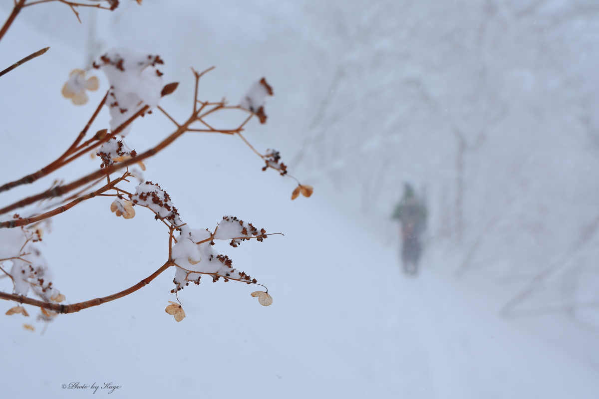 天気予報は曇り/雪で風強め、気圧配置図で見ると等圧線の間隔は狭くなっていたので、強風で時折スポットで晴れ間が来る感じかな?もしくは、運良ければ午前中は割と晴れるかな?と思っていた。しかし、登り始める頃の空は真っ白で雪が舞い、視界はクリアではなかった。