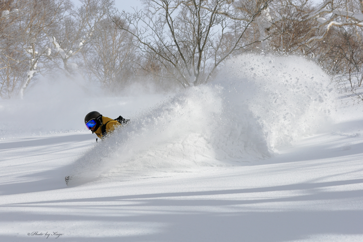 滑り出す時に丁度晴れて木漏れ日の中スプレーを飛ばすKさん。