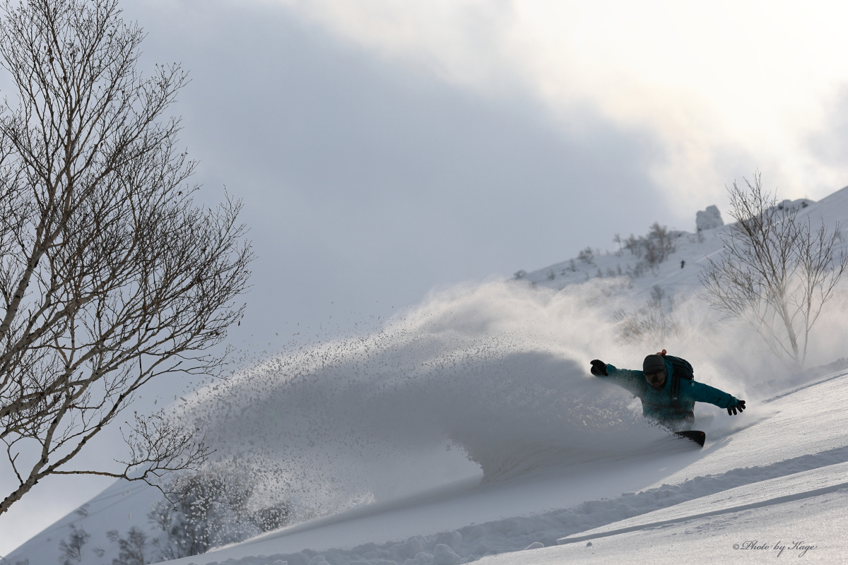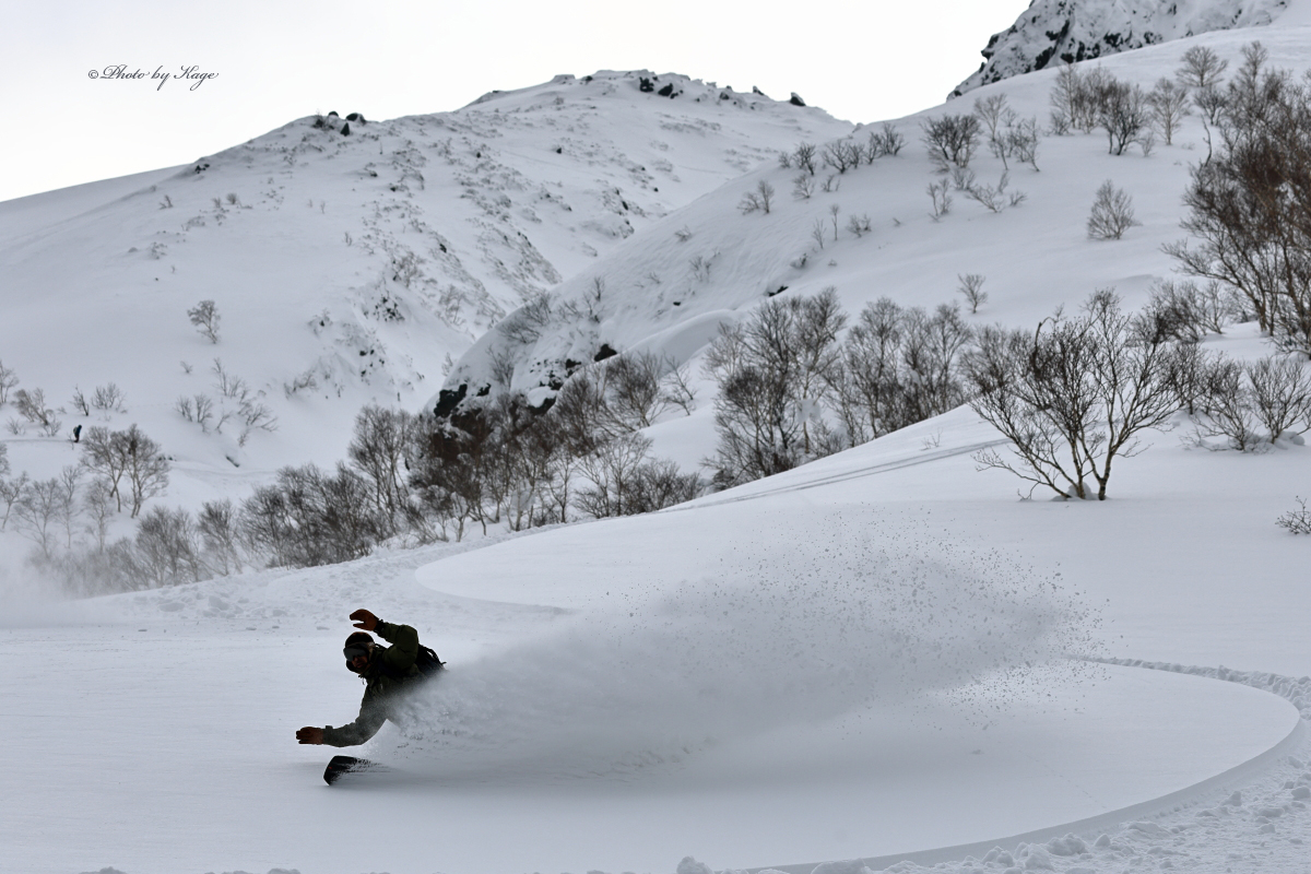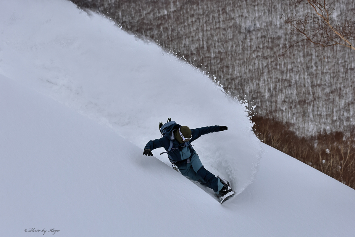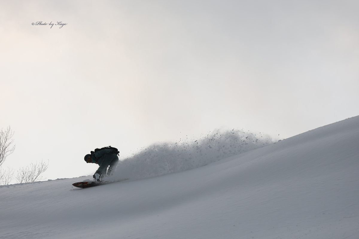 昨日のプラス気温の影響は標高と向きでカバー出来ましたが、先日の強めに吹いた風の影響が標高の高い所では多少あり雪の薄い所はありましたが、少し標高を下げればメッチャ良い雪でした。
