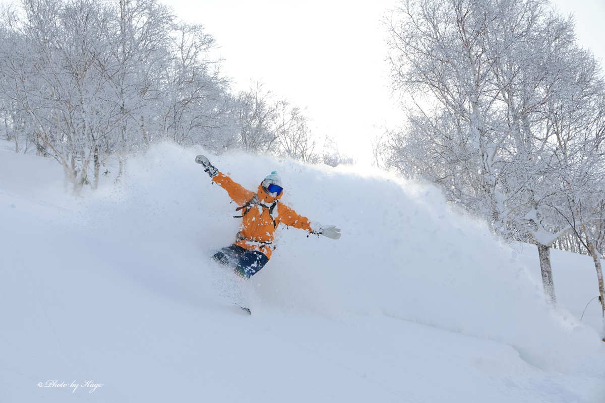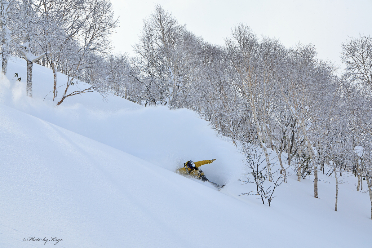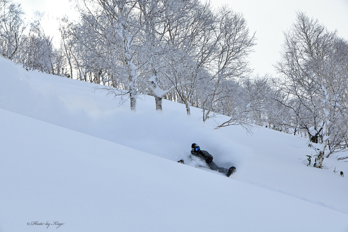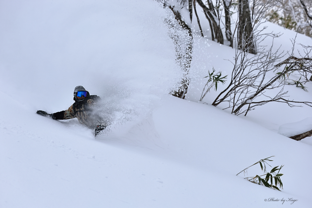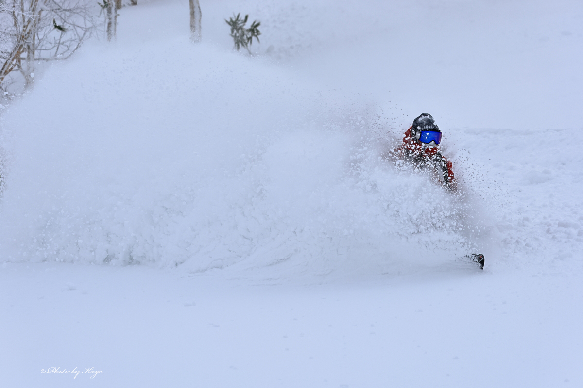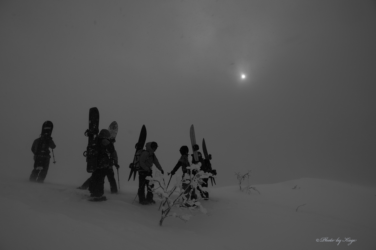 今日は終日雪の予報で吹雪く事も予想され、朝の天気から言っても終日悪天候が予想され「今日は全然光入らない真っ白な天気だろうな」と思っていた。お客様は3日連チャンのお客様と常連様だし、光が無いならスローシャッターとか白黒とかを多用していつもと違う写真を撮ろうと思っていた。しかし、視界の悪い悪天候の中僕らがラッセルに苦しんでいると暫くして、急に光と青空が射し込んだ。そんな事もあり本来狙っていた斜面ではなかったが、光のある内に目の前の斜面を滑る事になった。滑る準備をしている内に光が弱くなってしまい「あぁダメだったかぁ」と思ったのだが、運良く滑る時にもう一度光が射し込んでくれた。今季一の深さに斜度が出るまではターンが出来なかったが、斜度が増してからは滑っていても腰~胸はあるかと言う超ディープパウダーでのターンを楽しんだ。予定と違う動きにはなったが、棚から牡丹餅と言うか光のある中今季一の深さを味わえた。その後プランを組み立て直し、再びハイクアップし始めると、また吹雪いて来て「さっきは本当にラッキーだった!」と思いながら登り返していた。