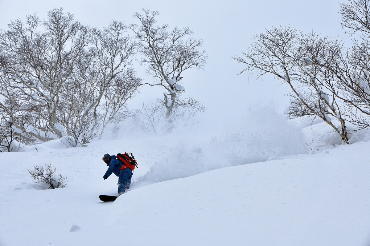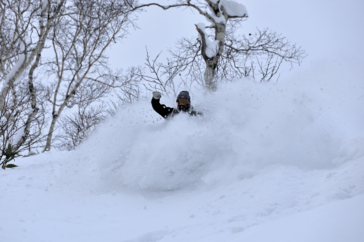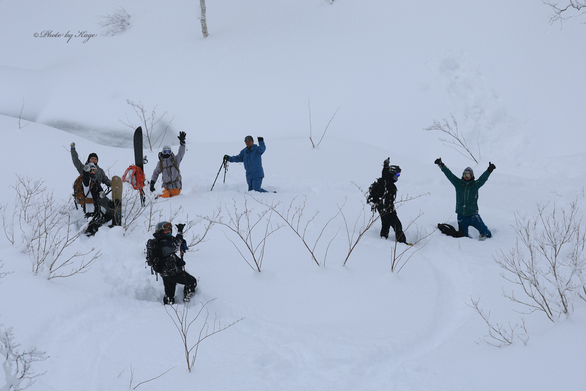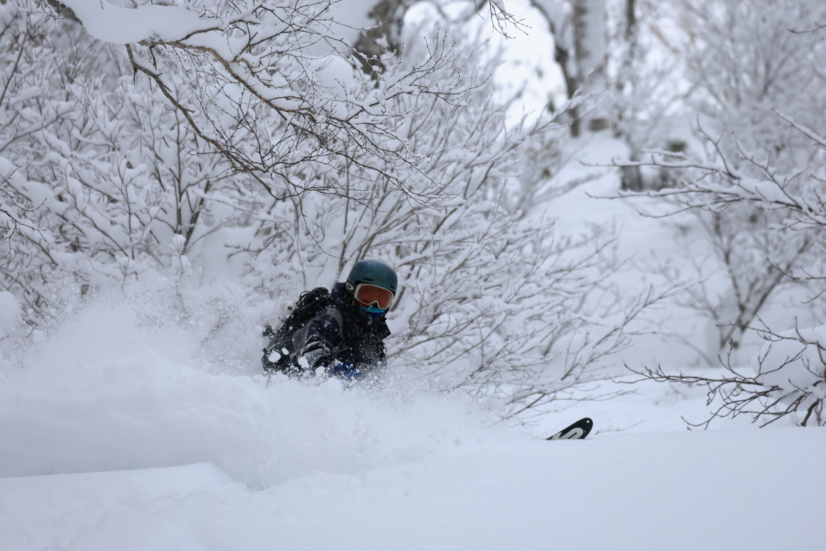 朝出勤時の僕の車の外気温はー15℃を示し寒い朝だったが、帰宅する夕方には0℃を示していて、温度変化の激しい一日となった。よくある放射冷却で冷えた朝は終日晴れてThe Dayとなってくれる事が多いが、今日は朝は晴れ間も見えたものの山の上には常にガスがあり白い一日となった。そのため、残念ながら標高の高いオープン斜面を狙う事は出来ず、ツリーのある斜面をチョイスする事になった。昨日からの降雪があまりなく、風も弱かったので斜面はリセットされていない事が予想されたので、なるべく前日までに人の入り込んでいないエリアへ行きたいのだが、まだまだ正月休みの人も居てニセコには多くの人が居る。BCで有名なアクセスポイントの一つであるとある駐車ポイントは今日を含め連日大氾濫状態だ。前日からの斜面のリセットが無い年末年始のニセコで、ガスによる視界不良のない標高帯で、且つなるべくブッシュや笹が少なく、人の入り込んでいない所を探すのはそう簡単ではないが、今日僕らが滑った場所はほぼノートラックだった。ガスによる視界不良も無く、懸念された温度変化による雪質の悪化も殆ど無く、良い雪を滑る事が出来ました。