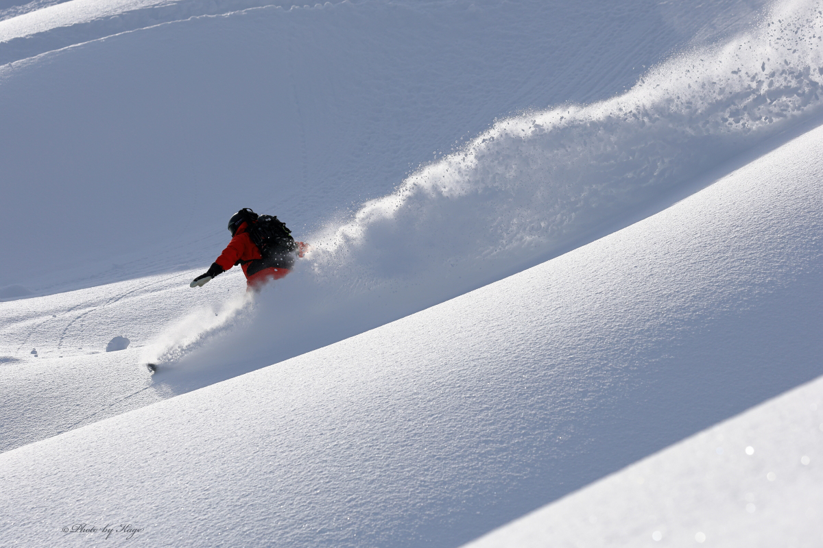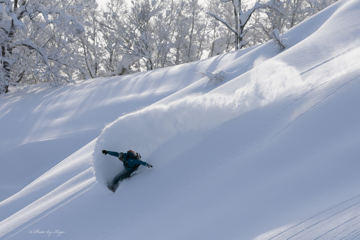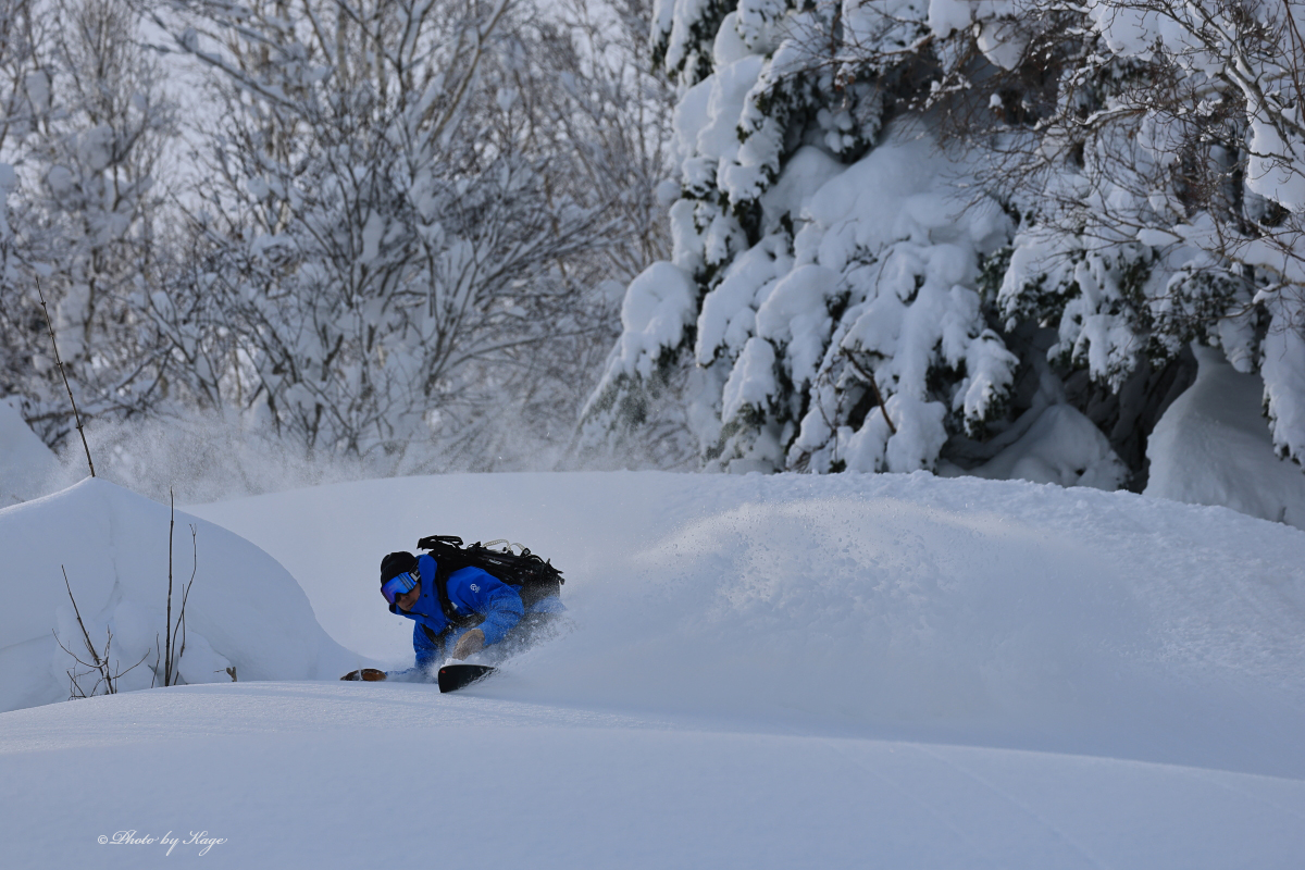 今日は朝からニセコ連峰が朝焼けに染まり、今季初めて?と言うほどの丸一日の晴れとなりました。しかしながら、気圧配置図で見ると北海道の上には低気圧が二つ掛かっており、何でこの気圧配置図でこんなに丸一日晴れるのかがイマイチ良く分かりませんが、晴れてくれるのは写真を撮る身としては大変有難い。しかも、極上中の極上という雪のコンディションを維持したままの晴れである。そりゃぁ~もうシャッターを押せば良い写真が撮れるってモンである。と言うのは、少々大袈裟ではあるが、過去の経験から滑る斜面と滑るラインに対する光の向きに合ったカメラポジションを取った上でちゃんと撮りたい写真の狙いを明確に持っていれば、あとは露出とピントを合わせてシャッターを押すだけ。そこで良いターンをしてくれれば尚更だが、最悪転ばずに通過してくれるだけでも絵になるのだ。今日は滑れる気心知れた常連様達だったので、良い写真を量産する事が出来ました。これには当然の事ながら、昨日の曇りのち晴れの天気でニセコの主要BCエリアは一通りトラックが入りギタギタ状態ながら、今日僕らが行ったポイントは完全ノートラックの他人の声も気配も感じない貸切のポイントに行けてこその話なのは言うまでもない。そこにはPowder Companyの長い経験と歴史と秀でた個々のガイドの能力、そして数多く在籍しているガイド陣からの情報網などの総合力&サポート力が詰まっている。例えば、今日ニセコは丸一日晴れたと前述したが、実は場所によっては山に雲が張り付き視界が悪かったり、風が強かった所もあったようだが、今朝本日のリーダーガイド山田誠が「あっちの山の方がこっちの山よりも安定して晴れそうな気がするんだよなぁ~」と言っていて、その読みがものの見事に的中して僕らのポイントは終始素晴らしい光が入っていたのだ。勿論ガイドの読みが外れる事もあるが、やはり長年の経験は生きる場合が多いのだ。今日の最高の一日は、天気と極上の雪と貸切の極上斜面、Powder Companyの力、全てが噛み合わさっての事。これは普通の事ではないと改めて思う。本当にお蔭様で最高の一日になりました。ありがとうございます!!