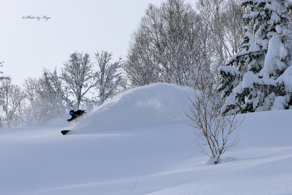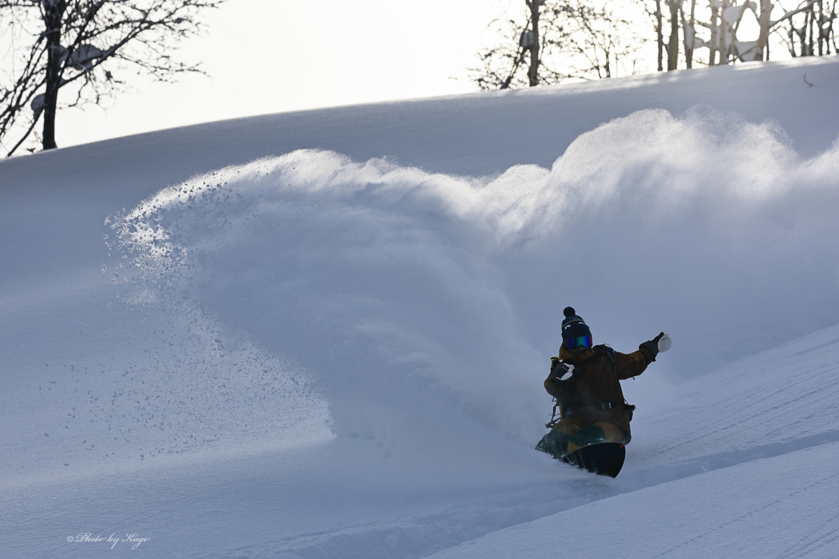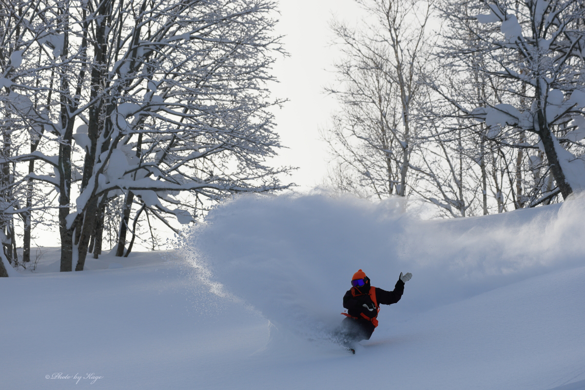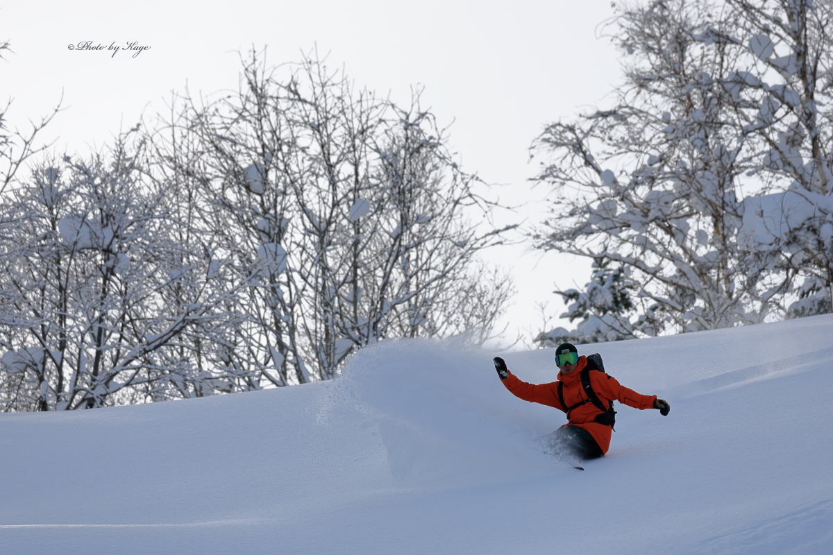 今日は朝からニセコ連峰が朝焼けに染まり、今季初めて?と言うほどの丸一日の晴れとなりました。しかしながら、気圧配置図で見ると北海道の上には低気圧が二つ掛かっており、何でこの気圧配置図でこんなに丸一日晴れるのかがイマイチ良く分かりませんが、晴れてくれるのは写真を撮る身としては大変有難い。しかも、極上中の極上という雪のコンディションを維持したままの晴れである。そりゃぁ~もうシャッターを押せば良い写真が撮れるってモンである。と言うのは、少々大袈裟ではあるが、過去の経験から滑る斜面と滑るラインに対する光の向きに合ったカメラポジションを取った上でちゃんと撮りたい写真の狙いを明確に持っていれば、あとは露出とピントを合わせてシャッターを押すだけ。そこで良いターンをしてくれれば尚更だが、最悪転ばずに通過してくれるだけでも絵になるのだ。今日は滑れる気心知れた常連様達だったので、良い写真を量産する事が出来ました。これには当然の事ながら、昨日の曇りのち晴れの天気でニセコの主要BCエリアは一通りトラックが入りギタギタ状態ながら、今日僕らが行ったポイントは完全ノートラックの他人の声も気配も感じない貸切のポイントに行けてこその話なのは言うまでもない。そこにはPowder Companyの長い経験と歴史と秀でた個々のガイドの能力、そして数多く在籍しているガイド陣からの情報網などの総合力&サポート力が詰まっている。例えば、今日ニセコは丸一日晴れたと前述したが、実は場所によっては山に雲が張り付き視界が悪かったり、風が強かった所もあったようだが、今朝本日のリーダーガイド山田誠が「あっちの山の方がこっちの山よりも安定して晴れそうな気がするんだよなぁ~」と言っていて、その読みがものの見事に的中して僕らのポイントは終始素晴らしい光が入っていたのだ。勿論ガイドの読みが外れる事もあるが、やはり長年の経験は生きる場合が多いのだ。今日の最高の一日は、天気と極上の雪と貸切の極上斜面、Powder Companyの力、全てが噛み合わさっての事。これは普通の事ではないと改めて思う。本当にお蔭様で最高の一日になりました。ありがとうございます!!