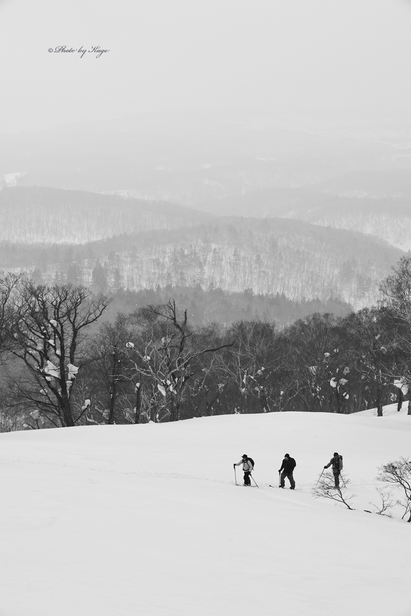結局、下山中に雨が降り始めほんの少し濡れた程度で済んだのでほんとラッキーだったし、町でプラス7.3℃まで上がったが1stレイヤーで登ったが全然汗もかかず、程よい風のお蔭で暑さも感じず、ガスによる視界不良も無く、実に快適にツアーを過ごせた。勿論、それはビショ濡れでとても寒く、視界不良で撮影にならないという最悪の想定をしていたから快適に感じたのかもしれないが、妖怪板掴みに拠るストップスノー以外、今日は全てが良い方向へと転がったツアーだった。ただただ、妖怪さえ居なければ…。まぁこの気温では仕方がないかぁ。雪質を考えれば少しでも標高を上げたいが、標高を上げればガスによる視界不良となるので、そのギリギリの標高を狙って視界的にはバッチリだったのだから仕方がないね。