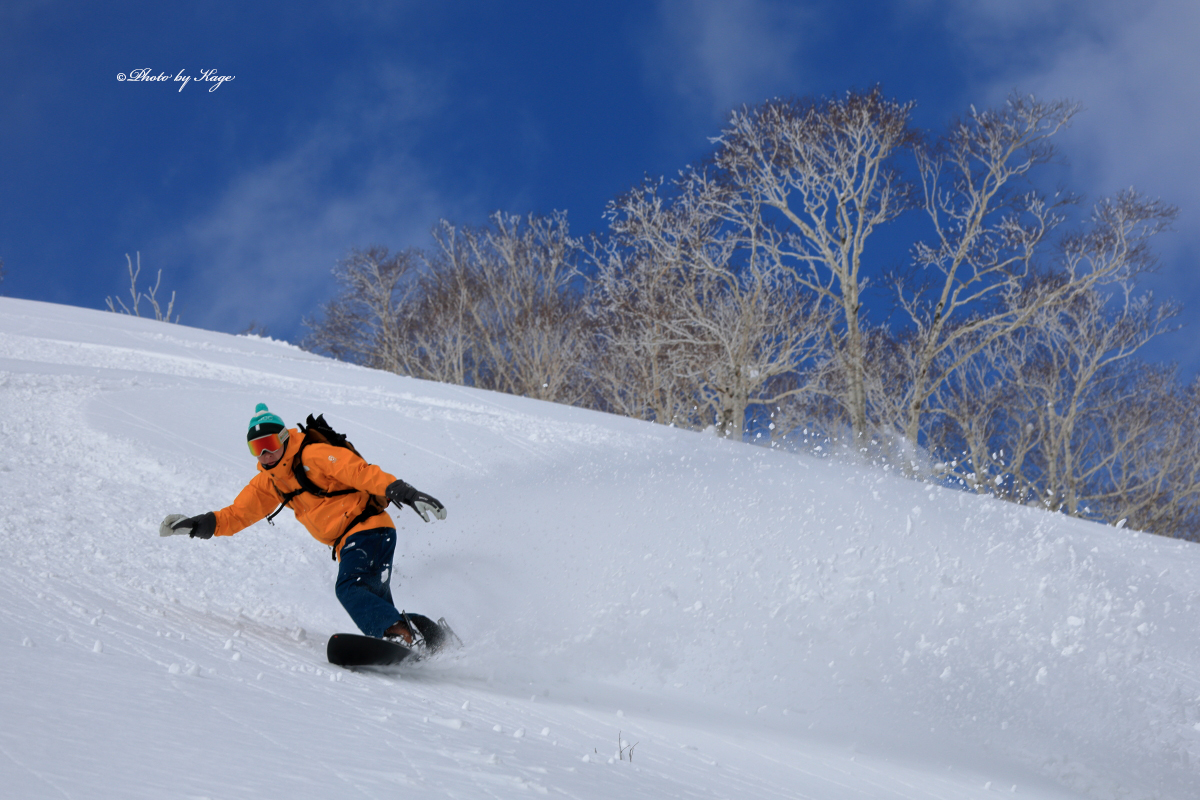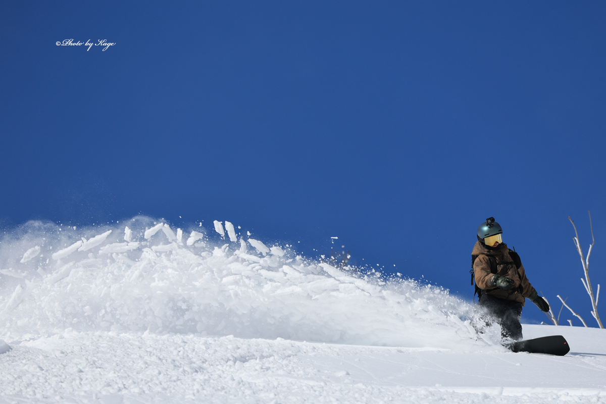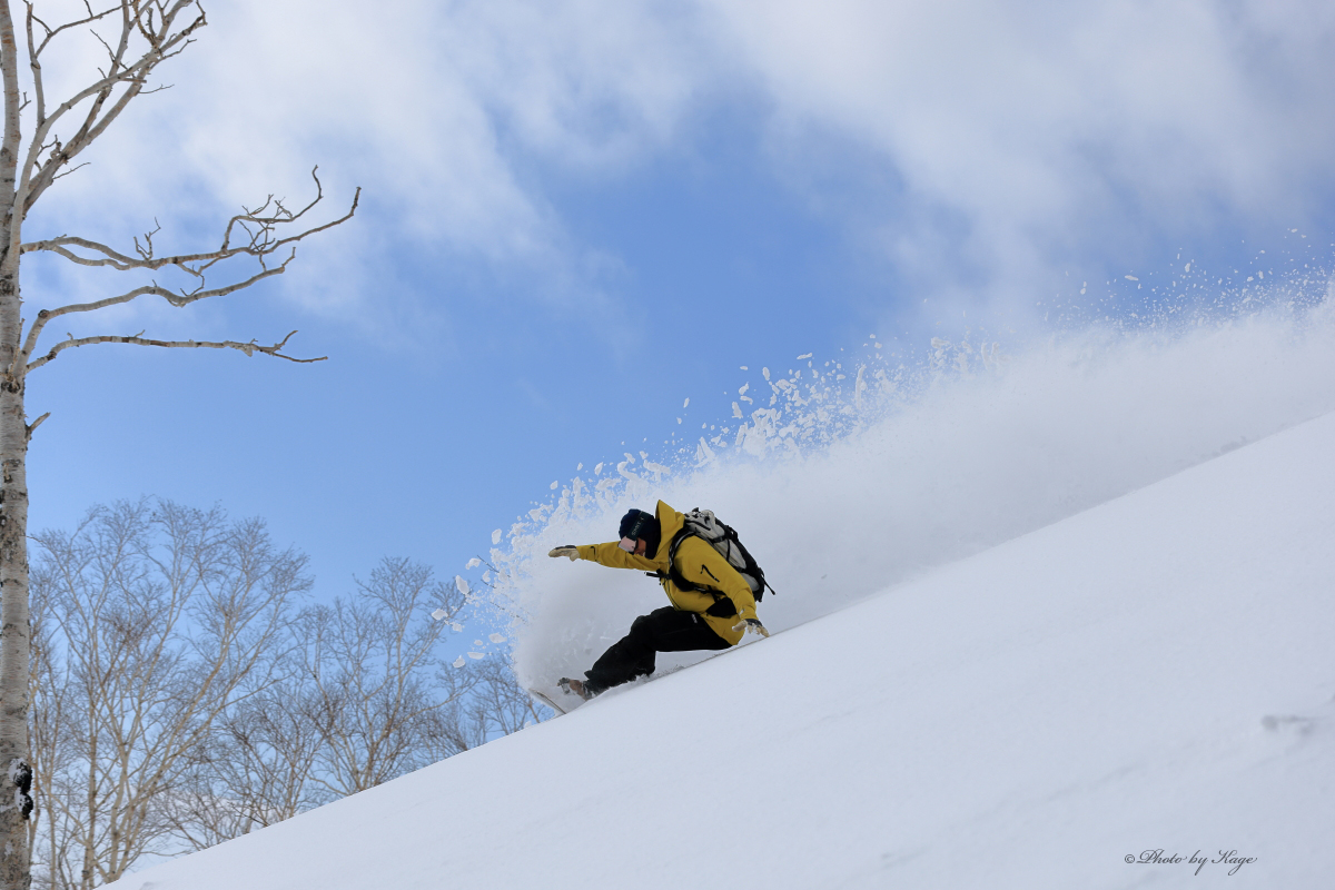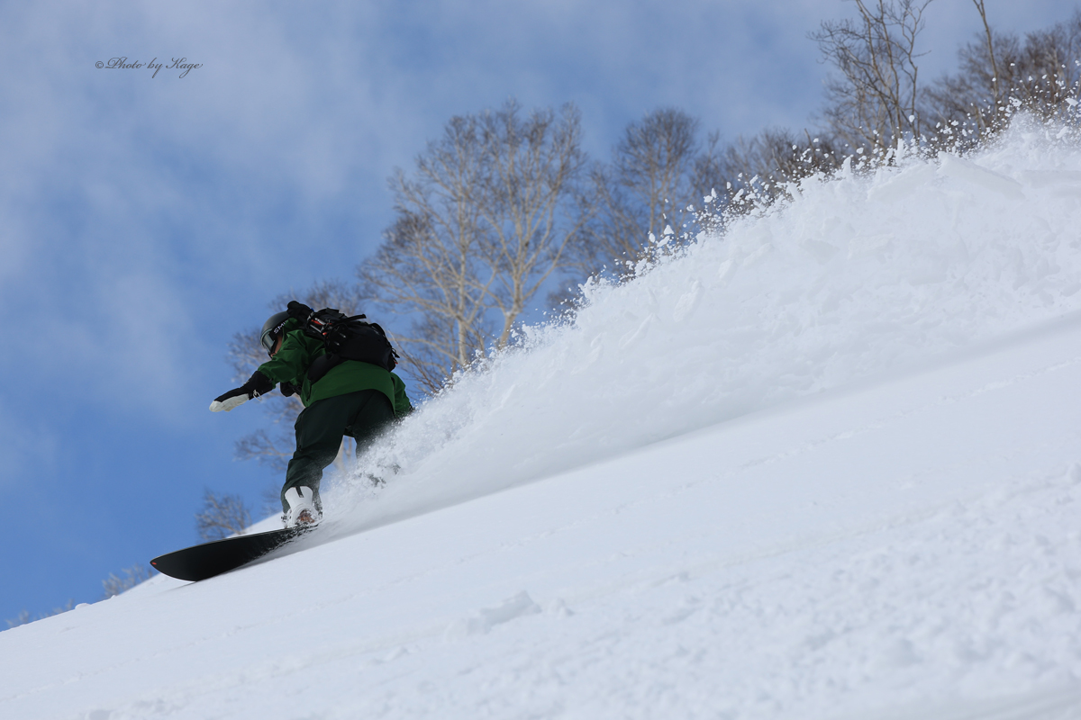 今日の天気予報は午前中晴れで昼から曇り、最高気温は町でプラス2℃まで上がるという予報でした。その為、今日はお客様と相談しハイクツアーではなく、リフトを使って効率良く晴天パウダーの写真を量産する作戦に出ました。しかし、早朝はスッキリと晴れ渡っていたのに、一部の予報で言われていた通り雲の多い天気となってしまい、青空だったのは最初の数本だけとなってしまいました。しかも、メインのリフトの運行開始が何でか遅れるという始末。まぁ仕方がないですね。ハイクしていたら晴れている内に滑れなかった可能性もあるし、アンヌプリピークなど標高の高い所はずっと風が強く真っ白で視界不良だったらしいので、青空バックのスプレーショットが撮れただけ良しとしよう。