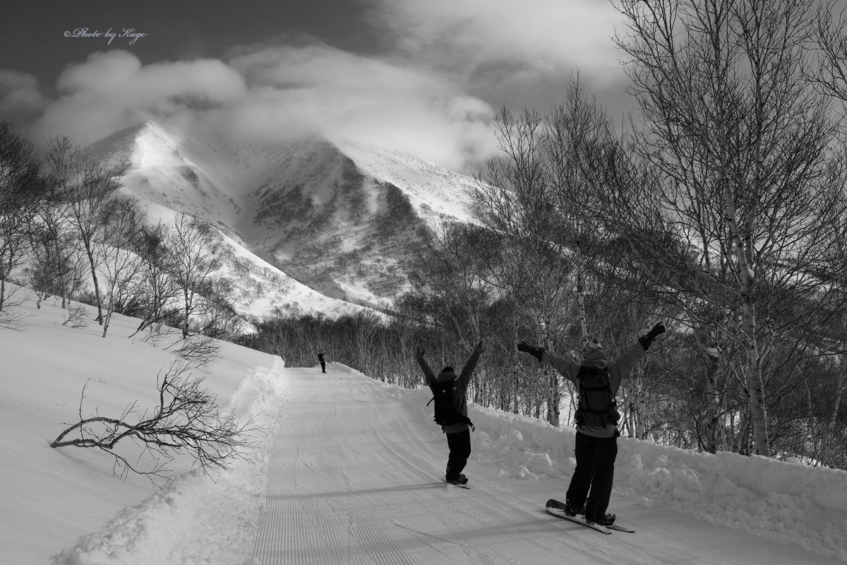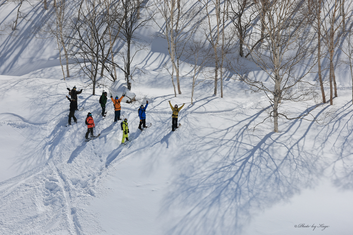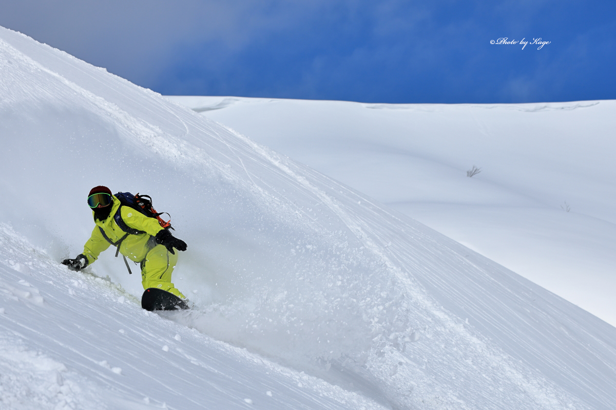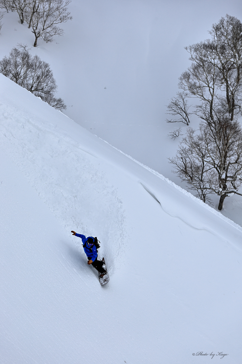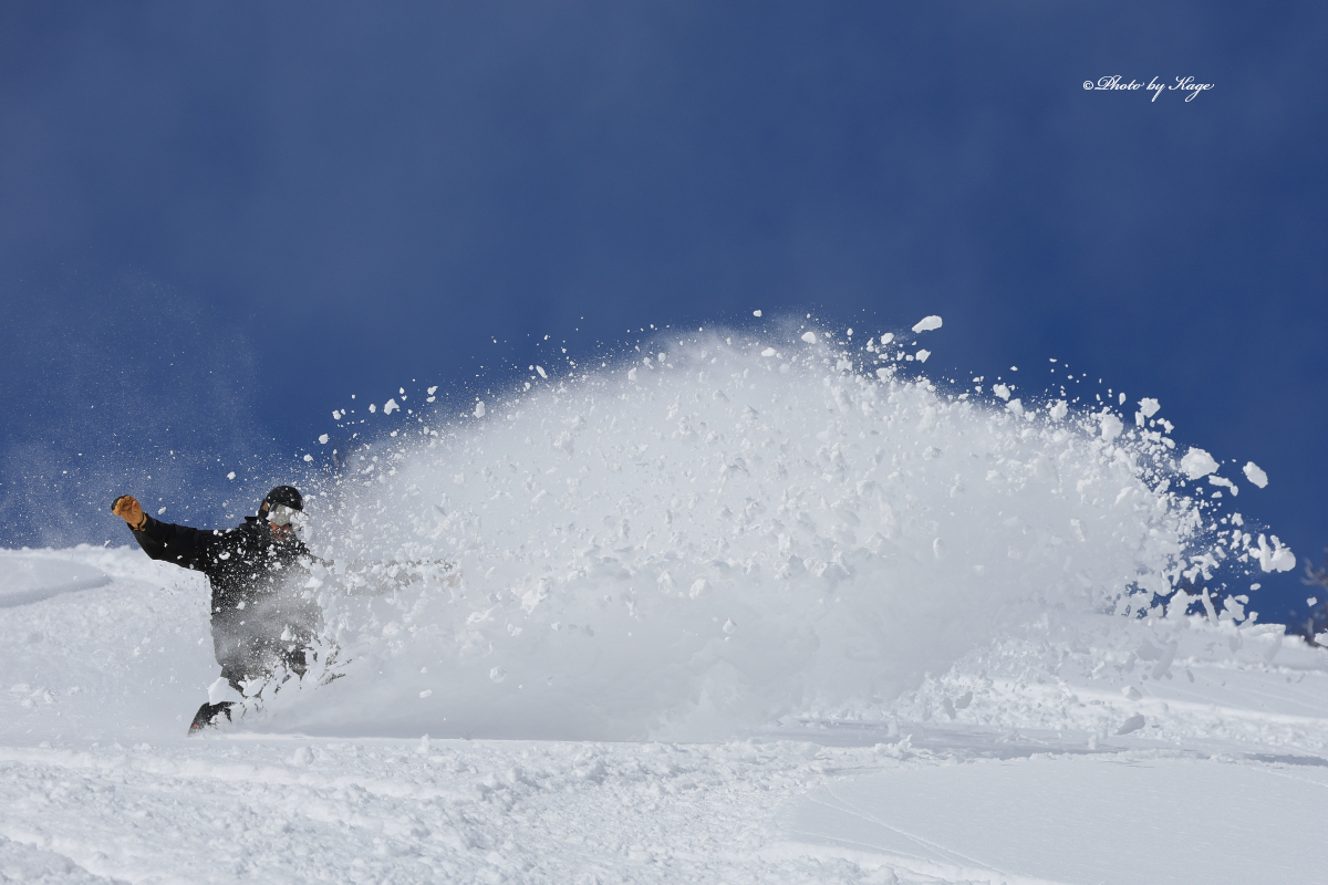 今日の天気予報は午前中晴れで昼から曇り、最高気温は町でプラス2℃まで上がるという予報でした。その為、今日はお客様と相談しハイクツアーではなく、リフトを使って効率良く晴天パウダーの写真を量産する作戦に出ました。しかし、早朝はスッキリと晴れ渡っていたのに、一部の予報で言われていた通り雲の多い天気となってしまい、青空だったのは最初の数本だけとなってしまいました。しかも、メインのリフトの運行開始が何でか遅れるという始末。まぁ仕方がないですね。ハイクしていたら晴れている内に滑れなかった可能性もあるし、アンヌプリピークなど標高の高い所はずっと風が強く真っ白で視界不良だったらしいので、青空バックのスプレーショットが撮れただけ良しとしよう。