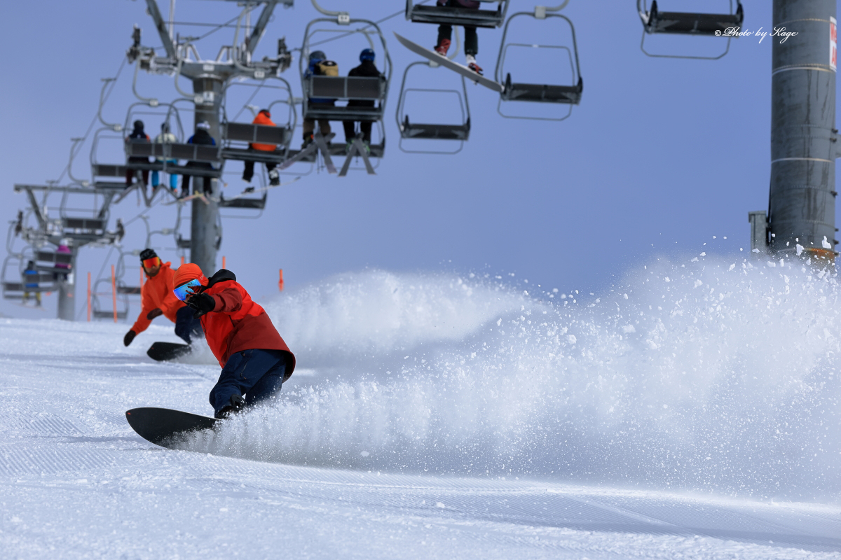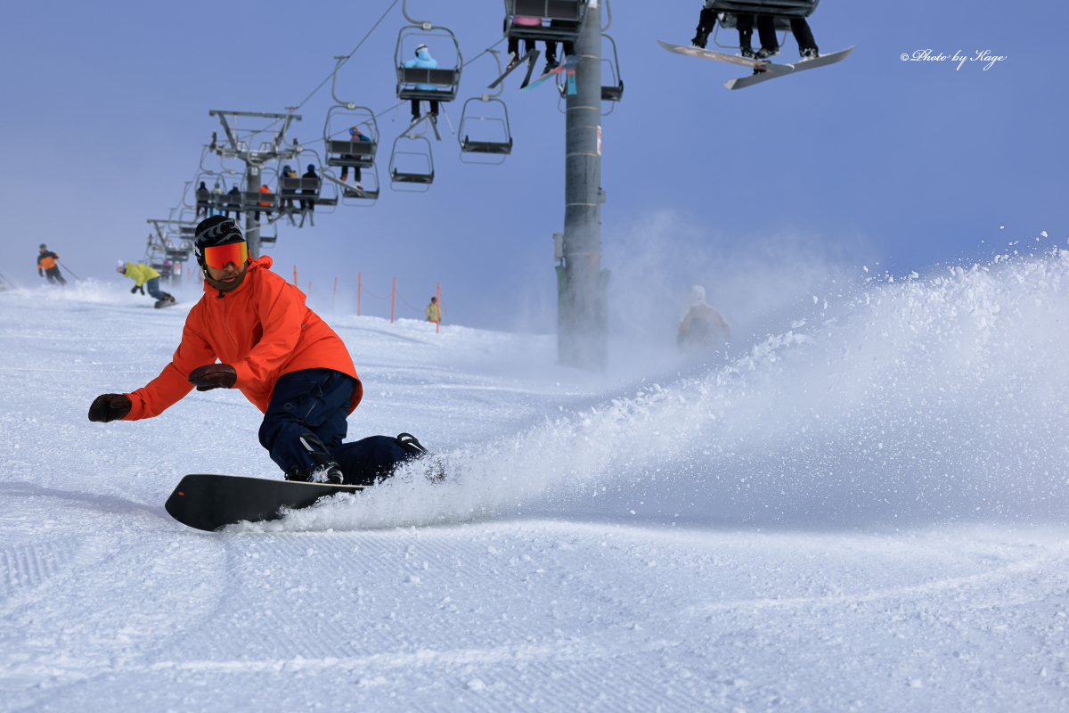 「マコちゃん誕生日なんだから先に好きな所滑ってぇ~!!」とオームに言われて、ノートラックで大きなスプレーを上げる53歳となった山田誠。