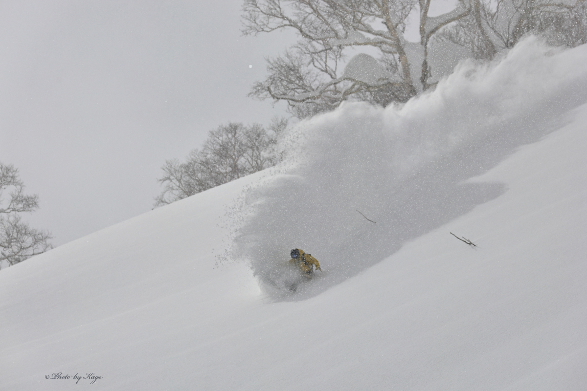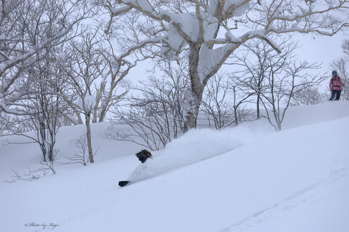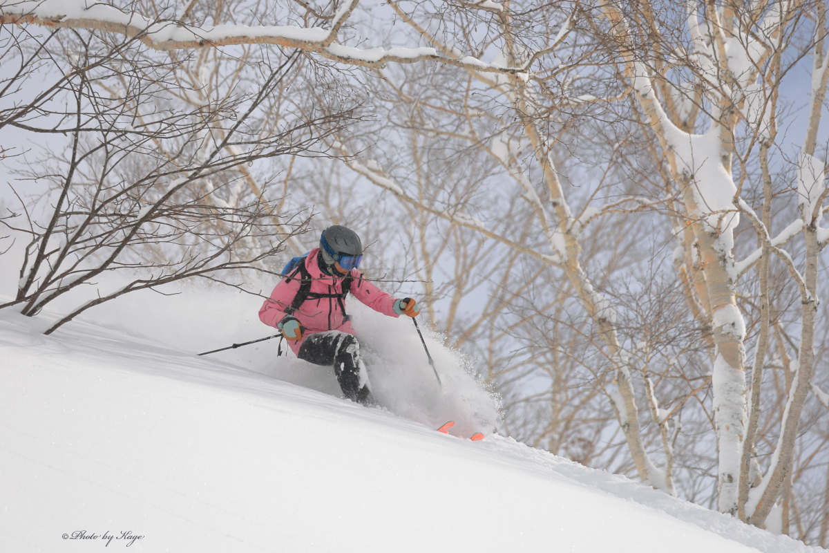 一本目は足慣らしも含めゲレンデ内の非圧雪コースで撮影したが、そのコースでも充分にパウダーを楽しめるのだが、ゲートを出た後のBCエリアは特別な世界でした。単純に雪の深さではなく、雪質が全く違って超絶走る超絶良い雪でした。本日のリーダーガイド佐藤岳が滑った後、「極上中の極上の雪」と言い、二週間毎にご参加頂いているOさんは「過去1の雪」と言った。それ程までに素晴らしい雪で、その雪を今日は他にあと3本滑る事が出来、内2本は光もバッチリ入ったし、もし今日リフトを使わずハイクでのツアーだったらラッセルに時間が掛かるので、2本位しか滑れないのでこの価値ある雪を倍滑れたことになる。今日ハイクからリフトに切り替えた選択は、体力面だけでなく、この価値ある雪を倍滑れたので本当に素晴らしいチョイスだったと思う。いやぁホント今日は最高でした。