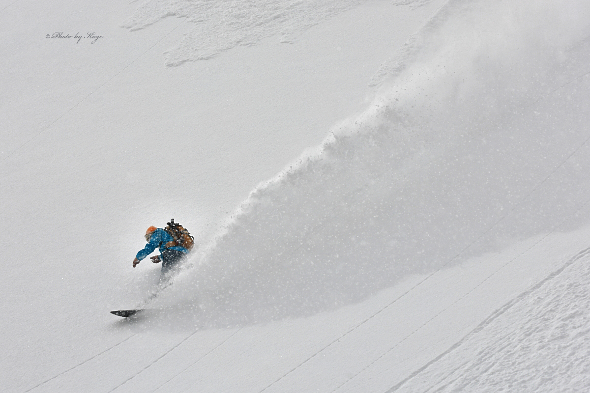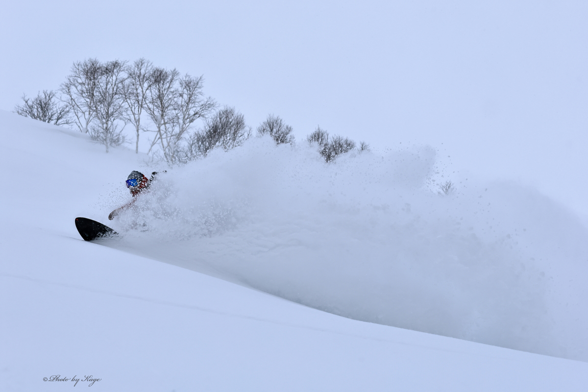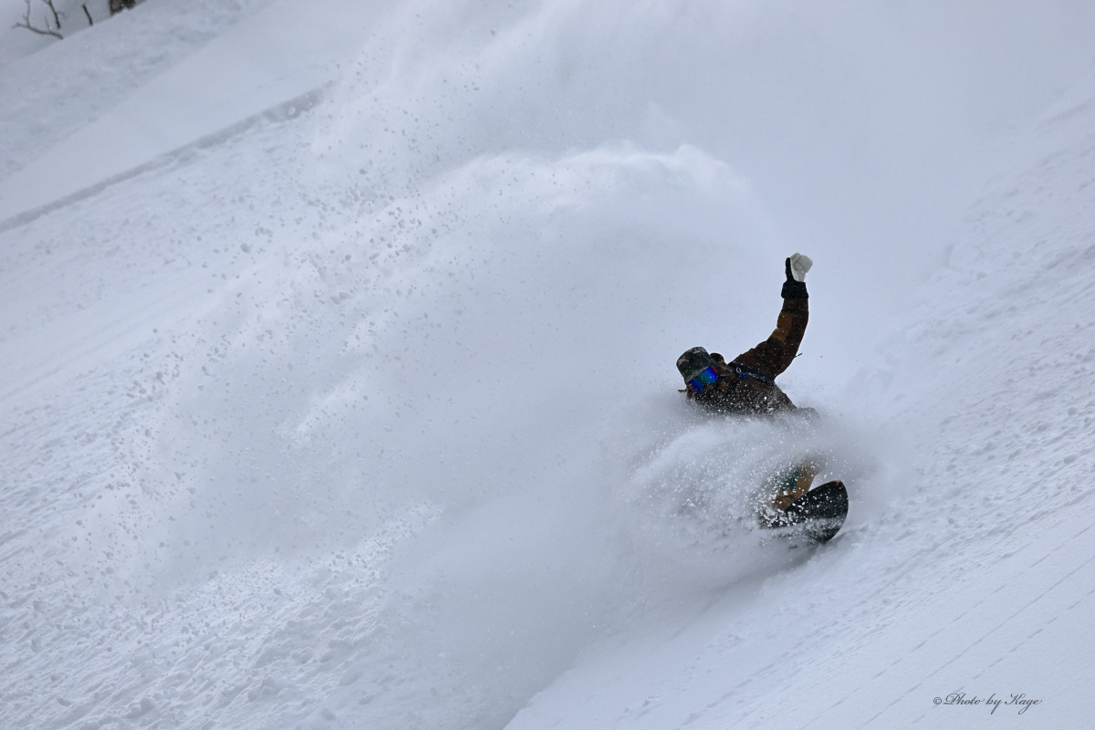このゲート出て一本目の雪を「過去1」と言い放ったOさん。新たにGETしたGentemstick Super Fish 176cmで特大のスプレーを上げる。