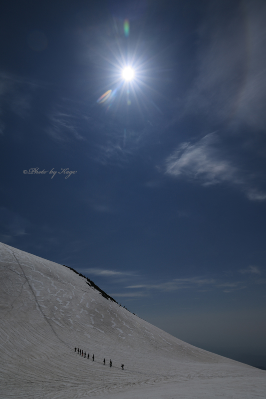 こちらもハロと環水平アークをバックにキラキラのザラメを滑るMちゃん。