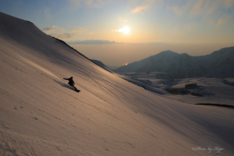 夕陽に染まる立山連峰をバックにターンをするGちゃん。