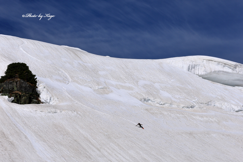 本日の一本目は岩と雪庇とクラックの間を抜けるラインを滑る昨日から急遽参加のGentemライダー鈴村新から。