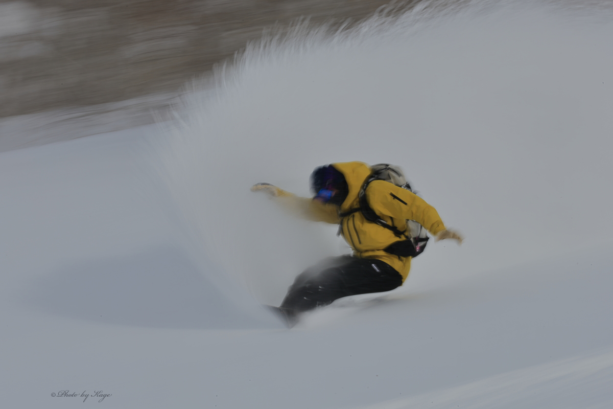 テールガイド佐藤岳。一発狙って来たターンをスローシャッターで撮ってみた。