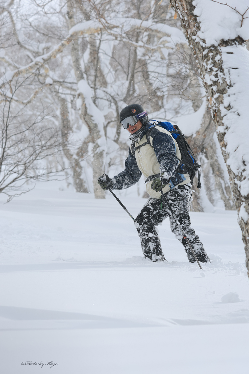 今日は晴れたり雪が降ったりと目まぐるしくコロコロと天気が変わり、風が強く寒い一日だった。2日前にプラス気温となったと思えば、今日は気温も低いは風は強いはで寒いし、雪も温度変化と風で色々である。風で叩かれガタガタになっていたり、地形が変わっている所もあれば、深いパウダーもある。ちょっとした向きや地形の違いで雪は色々なのだ。南面や東面では雪崩の兆候や破断する場所もあり注意が必要だ。