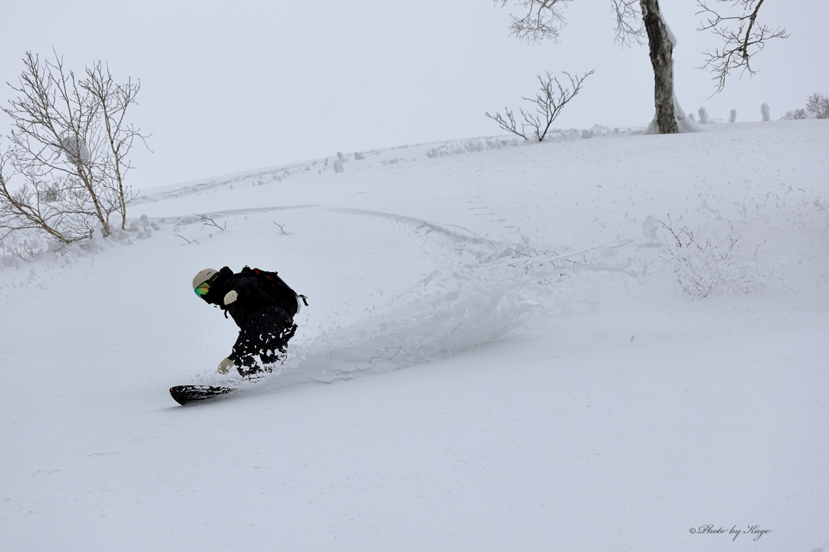 南東面で気持ち良さそうにスプレーを上げるA.S.さん。先月来られた時は災害級のディープパウダーだったのに…。