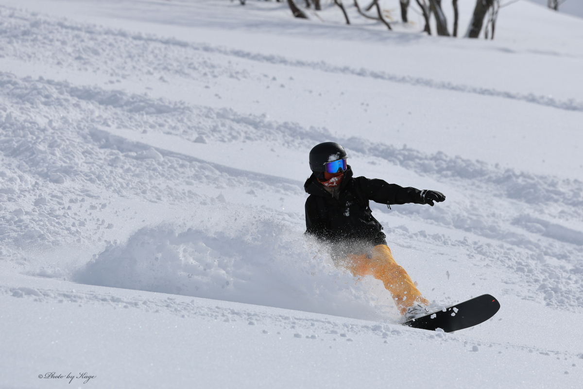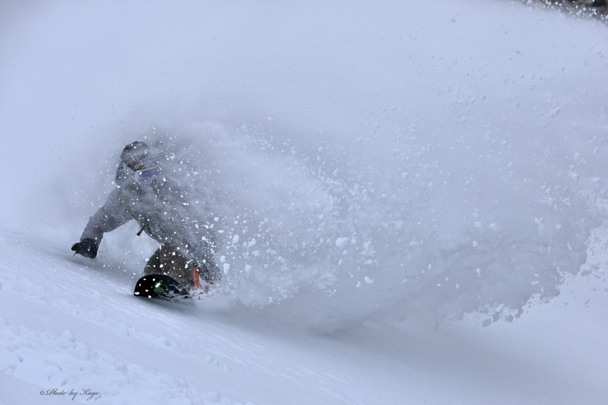 まずは足慣らしの緩い斜面にてスプレーを飛ばすJ.C.さん。