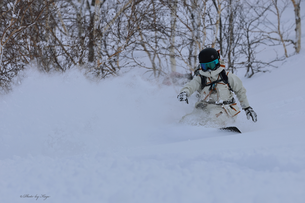 気持ち良さそうにパウダーのスプレーを上げるS.L.さん。