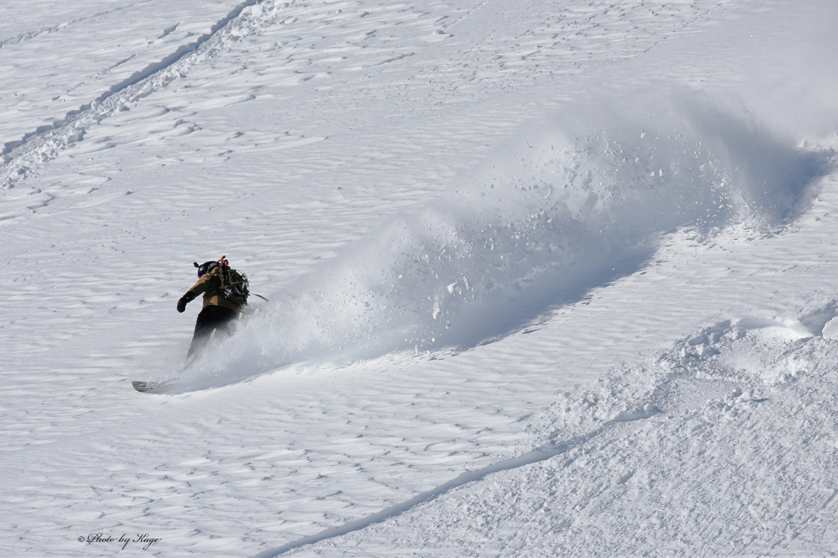 ピークからのフルオープンの大斜面を滑るNさん。昨年はEntry BCにご参加頂き、今回人生2回目のBC。