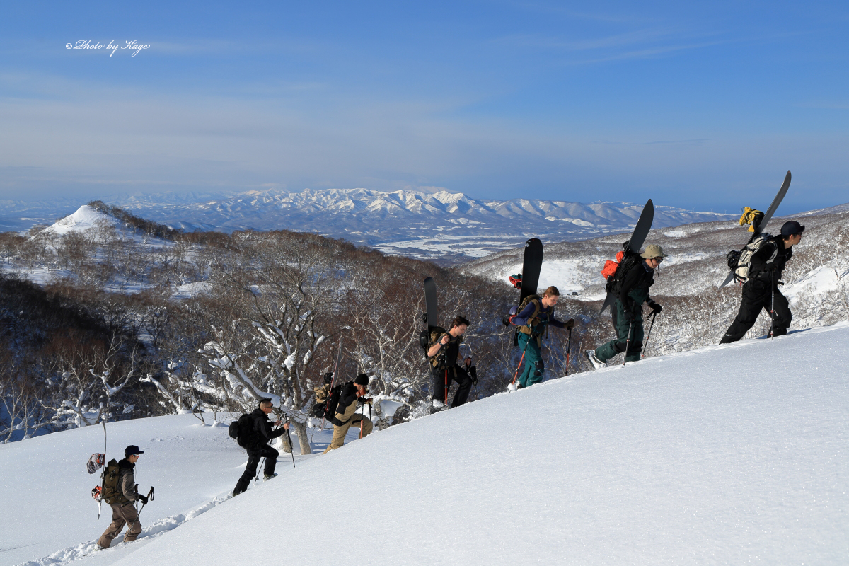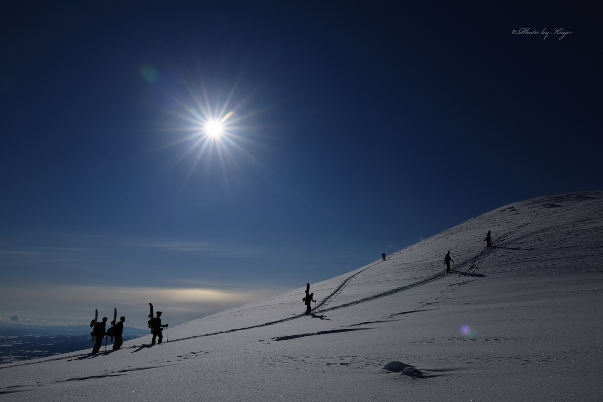 キンキンに冷え込んだ放射冷却のため、雪は湿気が抜けまるでダイヤモンドの如くキラキラと輝いているし、景色も遠くまで見渡せて綺麗だし、深い青空も綺麗だ。歩いているだけで心が躍り最高に気持ちが良い。約1時間半程歩いて予定していたピークに到着。思ったよりも風の影響を受けていたが、フルオープンの大斜面は柔らかいところもあって皆さん思い思いにターンを刻んでスプレーも飛ばせて興奮してましたね。今日は基本的にオープンバーンを4本。気持ちの良い天気にオープンバーンは最高ですね。最後の一本の時は天気が急変して、先程までの青空は何処へやら?雪が降り出してきましたが、一本目以外は全てノートラックの斜面を滑れて良かったですね。