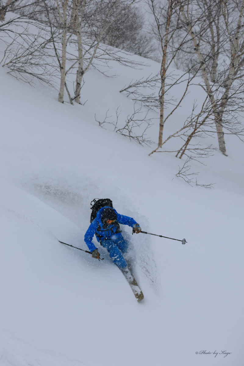 昨日までのBlogでも記載した通り、昨日一昨日で+7℃位まで気温が上昇し季節が完全に変わりました。昨日は残念ながらストップスノーさえ無ければというコンディションで、まともにスプレーが飛ばせない日となってしまいました。昨夜からの降雪を期待したのですが、朝起きると降雪は僅かで朝になってからようやくまともに雪が降り始めた感じでした。その為、昨日までの日射や温度上昇の影響によるクラストを考慮し、面を選んでどこまで大丈夫なのか?厳しいコンディションなのか?良いコンディションなのか?実際行ってみないと分からないという感じだった。
